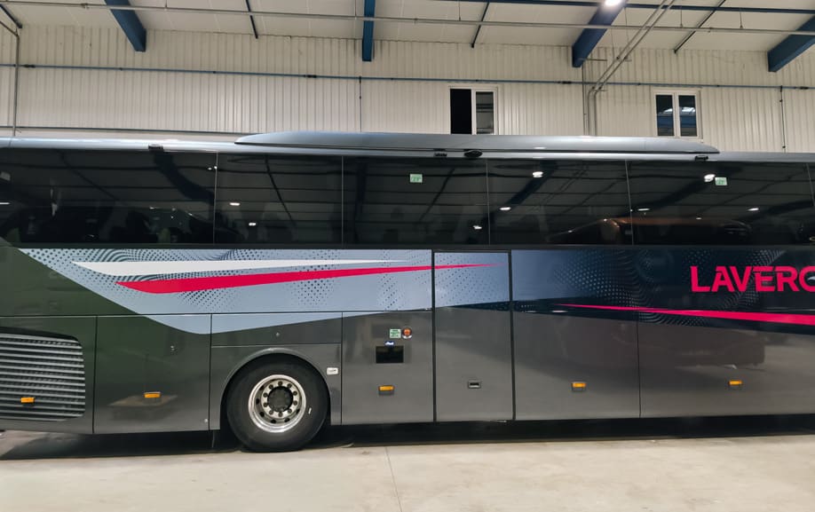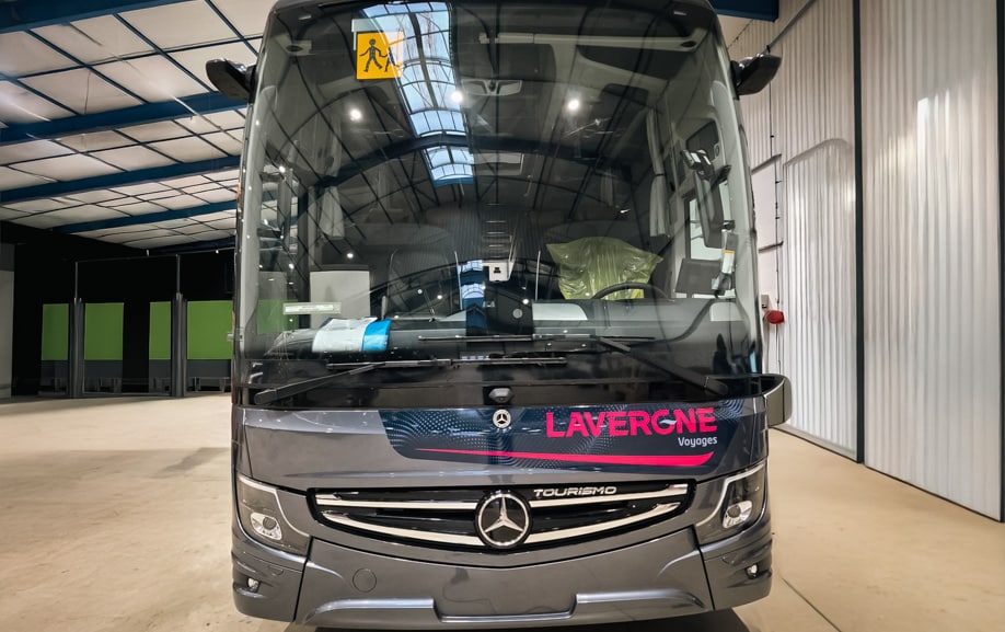 Autocars Lavergne a confié à Graphibus l’adaptation et la fabrication livrée autocar pour un Mercedes Tourismo 13 mètres.