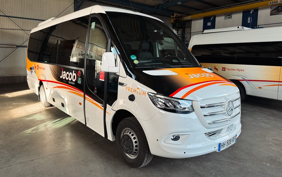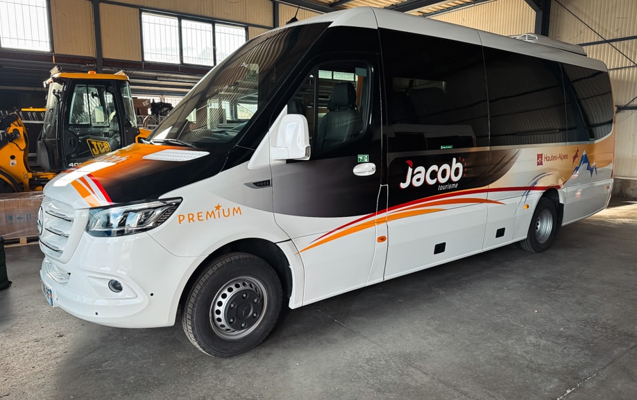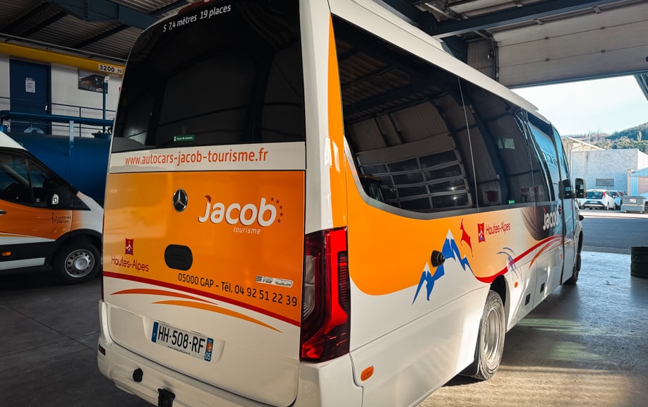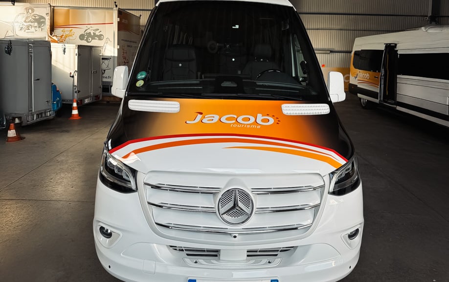 Jacob Autocars souhaitait appliquer sa livrée sur un Sprinter rallongé, avec une adaptation sur minibus cohérent sur les flancs et les faces (avant / arrière), tout en respectant les contraintes de découpe et les surfaces courbes typiques de ce gabarit.