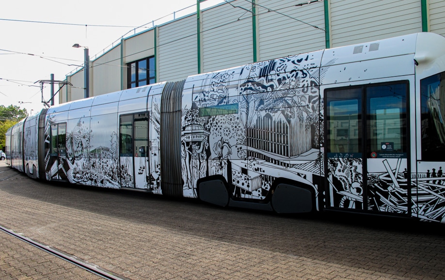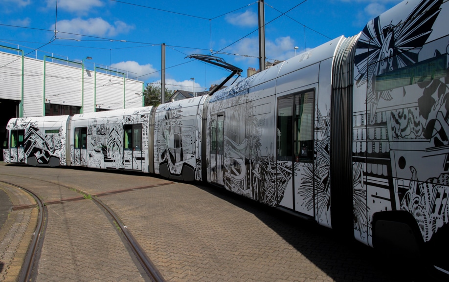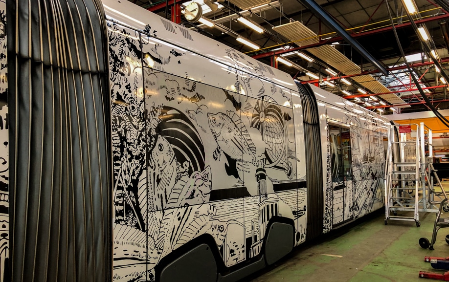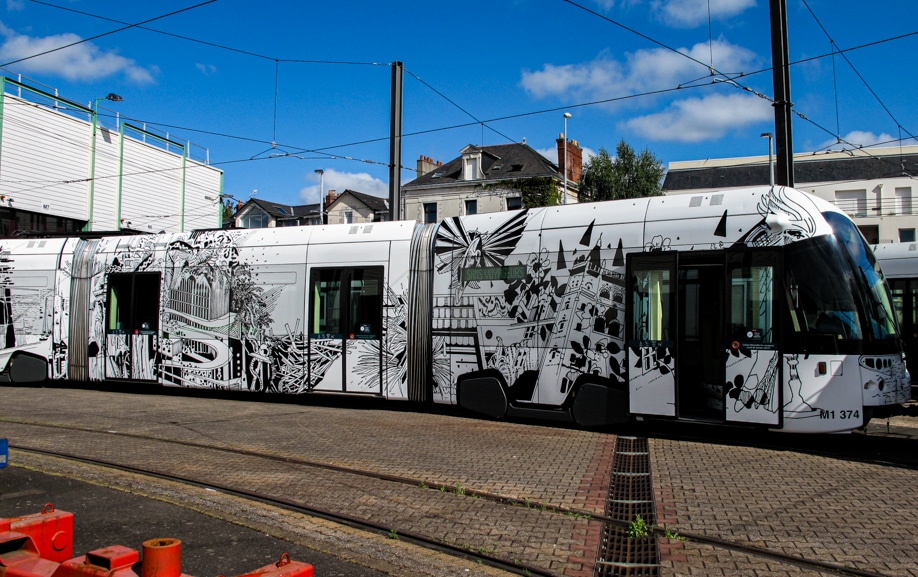Cette réalisation concerne l’habillage complet d’une rame du réseau de tramway nantais, avec un traitement graphique entièrement illustré en noir et blanc.