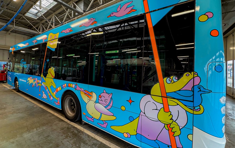 L’application du covering a été effectuée en tenant compte des spécificités techniques de l’Irizar ie2 (zones vitrées, surfaces courbes, intégration aux équipements d’exploitation), garantissant une cohérence entre l’expression artistique et l’ergonomie du véhicule.