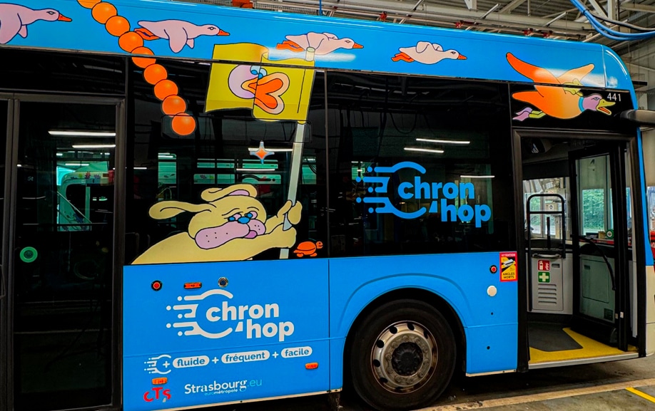 Graphibus a fait naître une création de livrée artistique réalisée Samuel Bas sur un autobus électrique Irizar ie2 du réseau Chron’hop de Strasbourg. Ce projet s’inscrit dans une démarche portée par la CTS en collaboration avec l’association Accélérateur de particules, visant à intégrer des créations d’artistes visuels contemporains directement sur le parc de bus urbain.